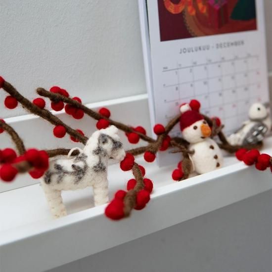 3,850円(税込)デンマークから届いた、北欧と手仕事のぬくもりを感じるレッドベリー/ホワイトベリーのポンポンが付いた羊毛フェルトのブランチ(枝)。クリスマスやお正月、秋冬インテリアにおすすめ。