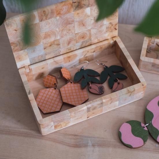 北欧の職人さんたちが、ひとつひとつ丁寧につくった木製ボックスです。中でも木目の美しさをデザインとして最大限に楽しむことができるのが、このインレイシリーズです。なめらかな肌触りと、木の温もりが感じられ、小物入れを開けるとジュニパーのいい香りがただよい、まるで北欧の森の中にいるかのような、最高の癒し空間を作ってくれます。