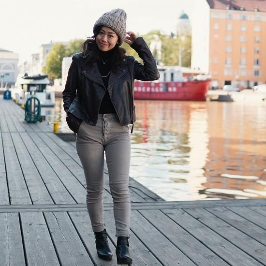 ほっこり手編み感のあるムッフィをあえてカッチリ系、きれい系のファッションと合わせればワンランク上のおしゃれ楽しめます。例えば華奢なワンピースと合わせたり、ロングコートやライダースジャケットにも甘辛あわせもぴったりです。