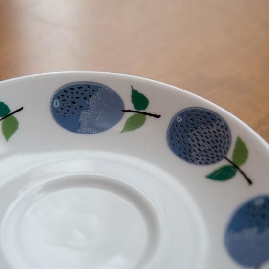 プルーヌスは青い実プラムが並ぶデザインですが、よく見てみると一つ一つが異なるイラストになっています。リンドベリのデザイン細部へのこだわりや、遊び心がうかがえる作品です。