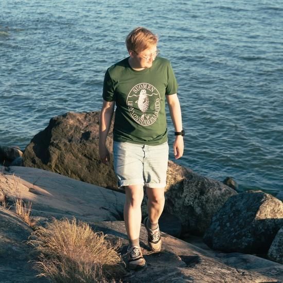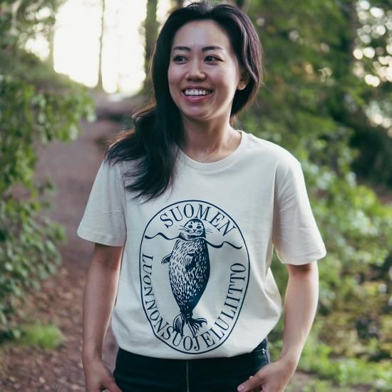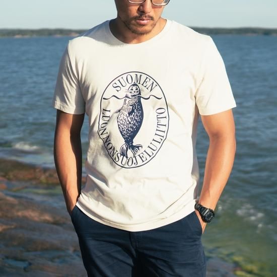 シンプルな中にどこかレトロ感のあるロゴモチーフがおしゃれなTシャツ、フィンランドから届きました。こちらは「フィンランド自然保護協会」のオリジナルアイテムです。高品質で知られるStanley/Stellaブランドの100%オーガニックコットンのジャージー生地のTシャツモデルを使用し、ソフトなさわりごちと程よいフィット感で着心地ばつぐん。レギュラーフィットのモデルで男性にも女性にもお使いいただけます。またおしゃれで着心地がよいだけではなく、実はこのTシャツは「フィンランドらしさ」がぎゅっと詰まった特別なTシャツなのです。