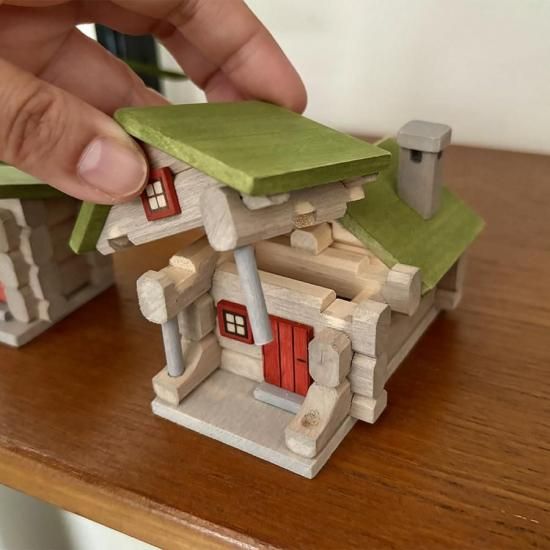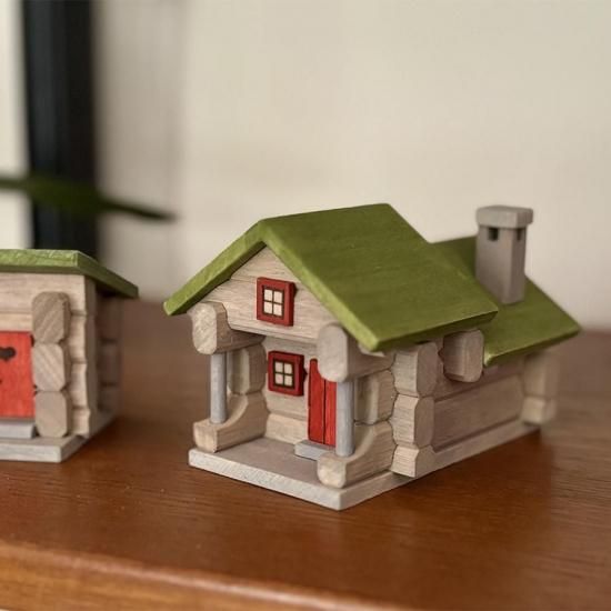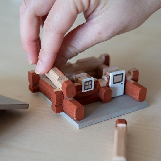 北欧のほんもののログハウスと同じように、木のパーツを組み合わせて作られています。それぞれのパーツをバラバラにして、また組み立てて完成させることができるユニークなオブジェです。