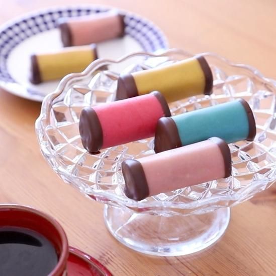 香り豊かなココア生地をアーモンドパウダーを贅沢に使って作る風味豊かなマジパンで包み、両端をチョコレートでコーティングした贅沢なお菓子。
