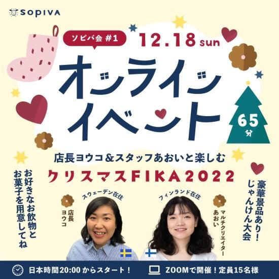 スウェーデン在住の店長ヨウコと、フィンランド在住のスタッフあおいとつながる、スペシャルなイベントを開催します。北欧と日本をリアルタイムをつないでの交流会。参加人数は最大15名の小人数制。私たちと一緒におしゃべりしながらFikaを楽しみましょう。北欧が大好きな参加者の皆さんと一緒につくるソピバ会♪私たちもワクワクドキドキ楽しみです。イベント詳細や参加特典はページ下部をご覧ください。