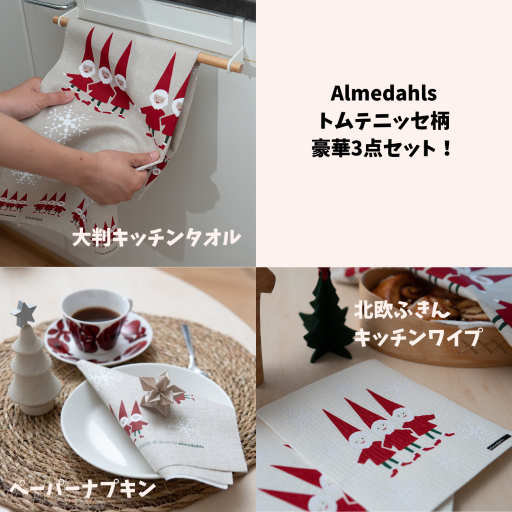 お決まりの(?)じゃんけん大会で盛り上がりましょう!人気の北欧ブランド「アルメダールス」のクリスマス柄「トムテニッセ」のキッチンタオル&ペーパーナプキン&キッチンワイプの豪華3点セット(総額3,740円相当)が2名様に当たります。サンタクロースのお手伝い、クリスマスの妖精「トムテニッセ」のデザイン。今年のクリスマスにぜひ使ってくださいね。