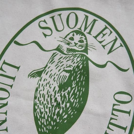 こちらのトートの特徴はなんといってもアザラシのロゴマーク。こちらはフィンランドの巨匠デザイナー、エリック・ブルーンによる「サイマーワモンアザラシ(フィンランド語ではサイマーンノルッパ)」のデザインです。エリック・ブルーンが1974年にフィンランド自然保護協会の依頼で制作したアザラシのポスター。そこに描かれたアザラシがあまりにもすばらしかったことから、その後フィンランド自然保護協会の公式ロゴマークとしても採用されました。