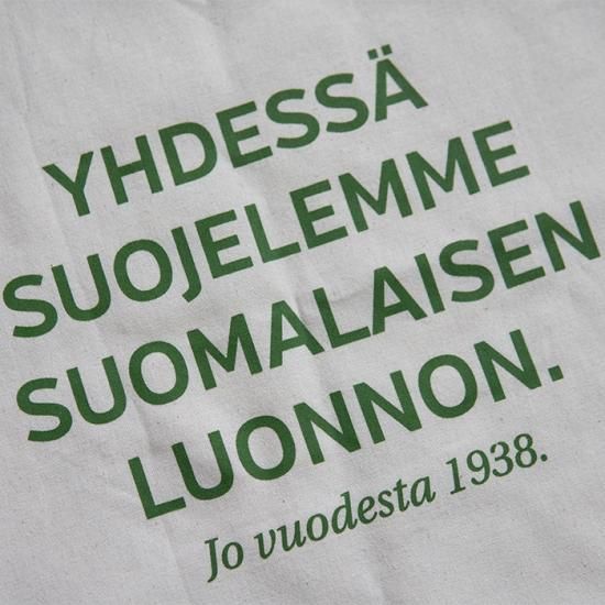 トートバッグの裏面には「Yhdessä suojelemme suomalaisen luonnon(一緒にフィンランドの自然を守ります。すでに1938年から。)」と書かれています。