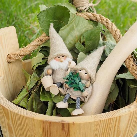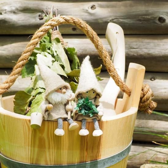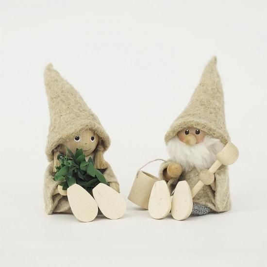 天然木とリネンの素材を組み合わせて、一点一点丁寧なハンドメイドで作られました。「サンタ」はサウナバケツとひしゃくを、「女の子」は白樺のヴィヒタを手に持っています。二人とも「サウナハット」を目深にかぶり、本格的なサウナの準備は万端です。