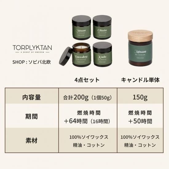 4点セットは、それぞれの香りをまとめてお得に堪能していただけます。お気に入りの香りが見つかりましたら、ぜひその香り単体のキャンドルをお選びください。気に入った香りをさらに長時間たっぷりお楽しみいただけます。