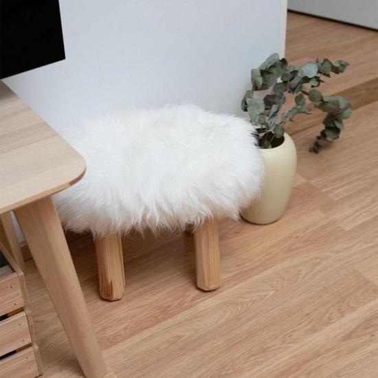 厳選した上質な1枚物のシープスキンを使用しています。しっとりとした艶のある肌触りが心地よく、使い込んでも毛が抜けにくく安心。使いはじめはほのかにパイン材の香りがありますが、羊毛特有のにおいはありません。