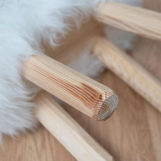 座面には美しい毛並みの1枚物シープスキンを厳選し、本体はパイン無垢材を北欧職人が丁寧に削り出しました。上質な素材と精緻な手仕事が際立つ、高級感あふれる一品です。